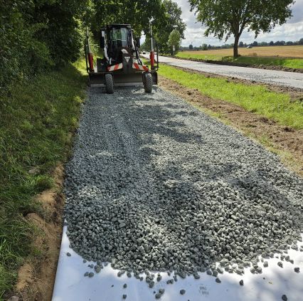 Der parallel verlaufende Radweg mit einer mittleren Breite von 2,1 m wurde auf rund 4.200 m² vollständig erneuert. Aufgrund des Baumbestands erfolgte der Rückbau des alten Asphalts überwiegend mittels Bagger. Anschließend wurden verschiedene Schottertragschichten auf ein zuvor verlegtes Vlies aufgebracht und der neue Radweg mit einer Asphalttrag- und Asphaltdeckschicht hergestellt.