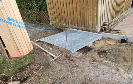 Zum Erhalt der angrenzenden Bäume wurde eine Wurzelbrücke errichtet. Diese besteht aus sechs Betonfundamenten, auf denen Gitterprofile montiert wurden. Der vorhandene Boden wurde mithilfe eines Saugwagens schonend abgetragen und durch spezielles Baumsubstrat ersetzt. Abschließend wurde die rund 4 m² große Fläche mit Drainpflaster geschlossen, um eine nachhaltige Belüftung und Entwässerung zu gewährleisten.